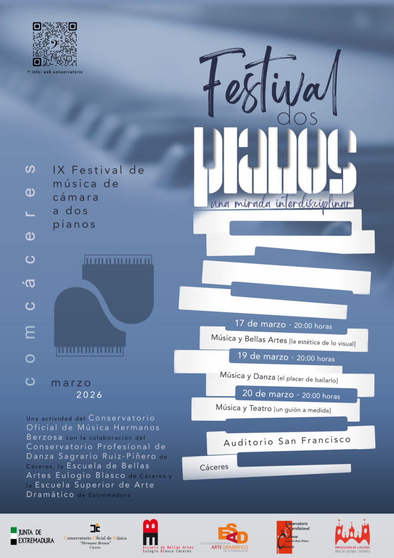 En esta edición del Festival de Música de Cámara a Dos Pianos, el Conservatorio Oficial de Música de Cáceres incorpora una dimensión interdisciplinar con la participación de la Escuela de Bellas Artes Eulogio Blasco . Esta colaboración busca poner en diálogo la música con distintas disciplinas artísticas, ampliando la experiencia […]